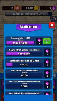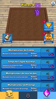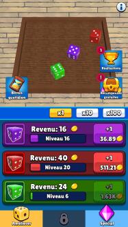 Lancer des dés et gagner un maximum d'argent à chaque combinaison, tel est l'objectif de ce jeu incrémental! Afin d'accroître vos gains, achetez des dés supplémentaires. Améliorez progressivement leur niveau, de manière à pouvoir toucher plus de pièces à chaque fois qu'une combinaison sortira (paire, brelan, carré, quinte). Puis laissez vos dés se lancer automatiquement, pendant que vos gains s'accumuleront de manière autonome. Un jeu relaxant qui continuera à oeuvrer pour vous, même en votre absence!