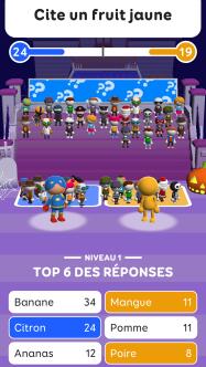 Fans de jeux télévisés, découvrez ce quiz interactif, inspiré d'un célèbre programme, dans lequel vous devez deviner les réponses les plus fréquentes données par le public! Dans la peau d'un candidat dont vous pourrez choisir l'apparence, participez à des tournois locaux, dans l'espoir de vous qualifier pour les prochaines phases. Répondez à des questions portant sur des thèmes variés (comme citer un type de transport ou un fruit jaune) et donnez un maximum de bonnes réponses, lors des manches successives, pour faire le meilleur score possible. Serez-vous capable d'être le grand vainqueur?